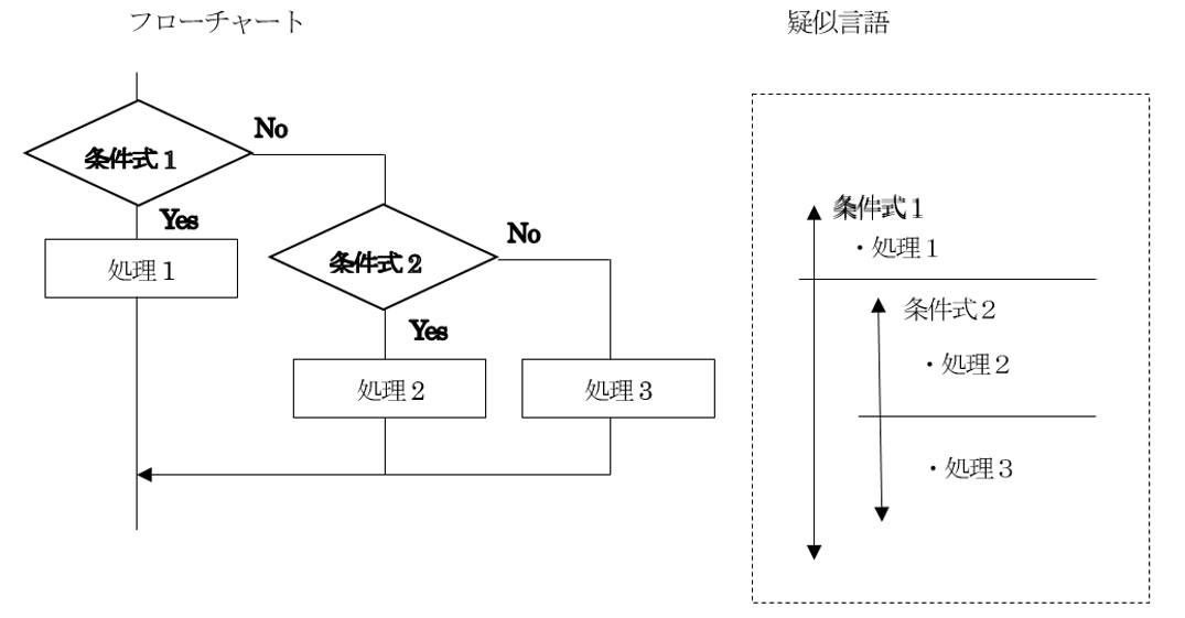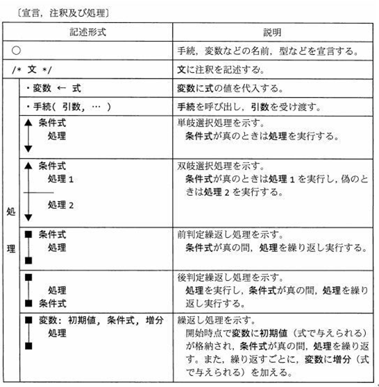 - 基本情報処理試験のアルゴリズムに関する問題ではフローチャートが使われていたが、現在ではフローチャートの代わりに疑似言語が使われている。