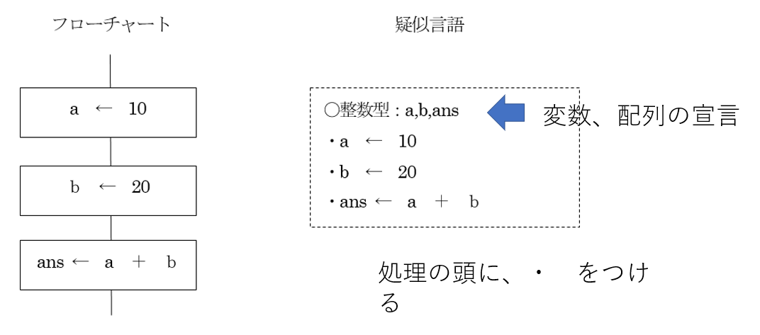 疑似言語では、プログラムで使用する変数、配列の宣言を書く。
