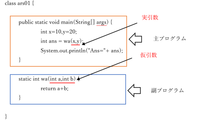 - JAVAでは、副プログラムはmainメソッド以外のメソッド